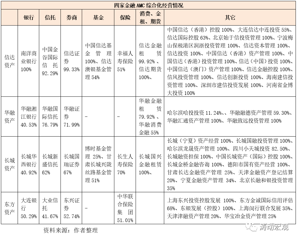 (2)1999年成立的四家金融AMC也已全部轉(zhuǎn)型為擁有各銀行、信托、券商、基金、保險(xiǎn)、消費(fèi)金融、金融租賃、期貨、資產(chǎn)管理、信用評(píng)級(jí)等各類金融牌照的金融控股集團(tuán),并廣泛涉足私募基金、房地產(chǎn)等業(yè)務(wù)。例如,信達(dá)資產(chǎn)擁有南洋商業(yè)銀行、金谷國(guó)際信托、信達(dá)證券、幸福人壽保險(xiǎn)和信達(dá)基金;華融資產(chǎn)擁有華融湘江銀行、華融國(guó)際信托、華融證券、華融消費(fèi)金融和華融金融租賃,長(zhǎng)城資產(chǎn)擁有長(zhǎng)城華西銀行、長(zhǎng)城新盛信托、長(zhǎng)城國(guó)瑞證券、長(zhǎng)生人壽保險(xiǎn),東方資產(chǎn)則擁有大連銀行、大業(yè)信托、東興證券、東方金誠(chéng)和中華聯(lián)合保險(xiǎn)集團(tuán)等。