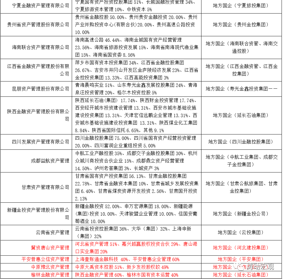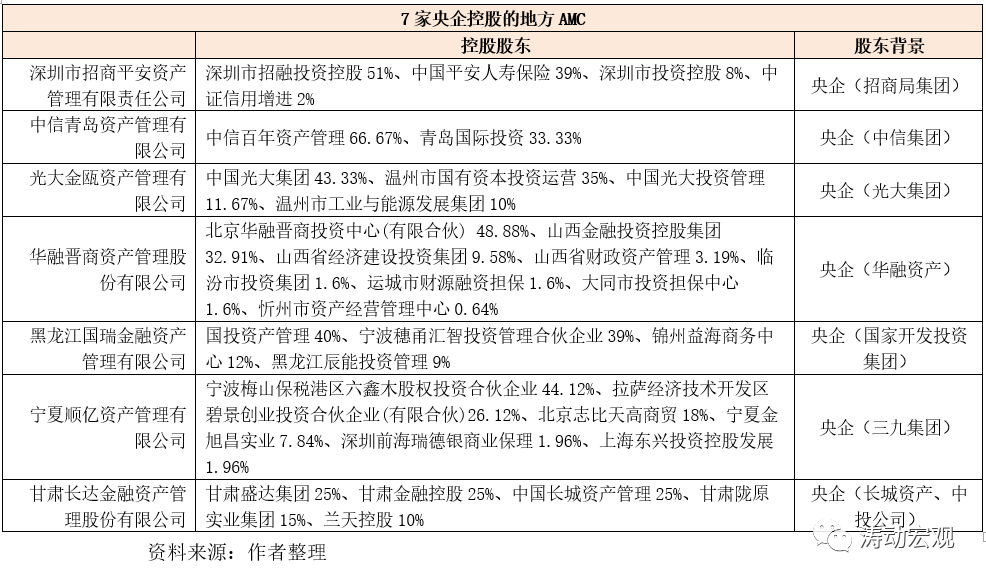 1、央企控股的地方AMC有7家,分別為招商平安資產(chǎn)管理(招商局集團(tuán))、中信青島資產(chǎn)管理(中信集團(tuán))、光大金甌資產(chǎn)管理(光大集團(tuán))、華融晉商資產(chǎn)管理(華融資產(chǎn))、黑龍江國(guó)瑞金融資產(chǎn)管理(國(guó)家開發(fā)投資集團(tuán))、寧夏順億資產(chǎn)管理(三九集團(tuán))、甘肅長(zhǎng)達(dá)金融資產(chǎn)管理(長(zhǎng)城資產(chǎn))。