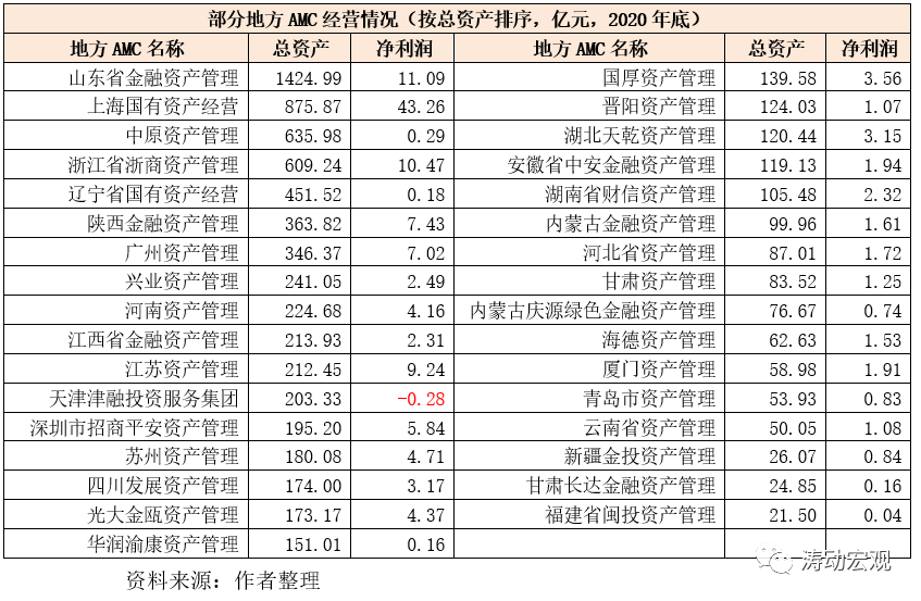 (1)總資產(chǎn)超過(guò)500億元的地方AMC有4家,從高到低依次為山東省金融資產(chǎn)管理(1424.99億元)、上海國(guó)有資產(chǎn)經(jīng)營(yíng)(875.87億元)、中原資產(chǎn)管理(635.98億元)以及浙江省浙商資產(chǎn)管理(609.24億元)。