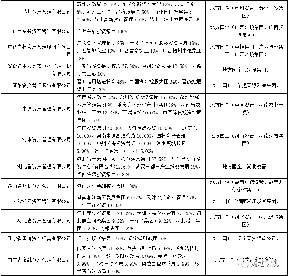3、民營(yíng)企業(yè)控股的地方AMC主要有10家,這些民營(yíng)地方AMC的控股股東大多為民營(yíng)企業(yè)集團(tuán),如和潤(rùn)集團(tuán)、正信集團(tuán)、永泰集團(tuán)、當(dāng)代集團(tuán)、宏遠(yuǎn)集團(tuán)與君正集團(tuán)、隆鑫集團(tuán)等。具體分別為上海睿銀盛嘉資產(chǎn)管理、天津?yàn)I海正信資產(chǎn)管理、重慶富城資產(chǎn)管理、國(guó)厚資產(chǎn)管理、湖北天乾資產(chǎn)管理、黑龍江省嘉實(shí)資龍昇資產(chǎn)管理、吉林省金融資產(chǎn)管理、慶源綠色金融資產(chǎn)管理和海德資產(chǎn)管理。