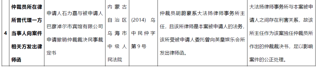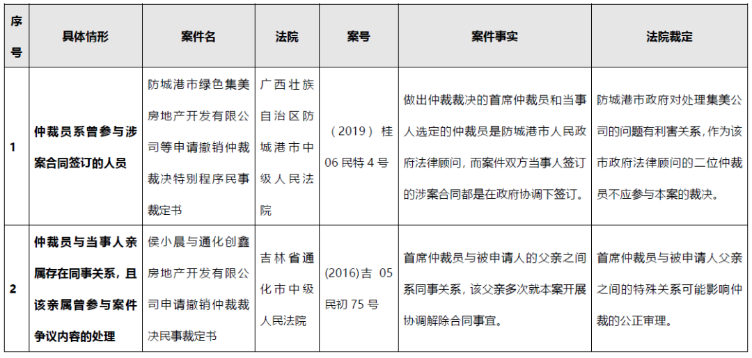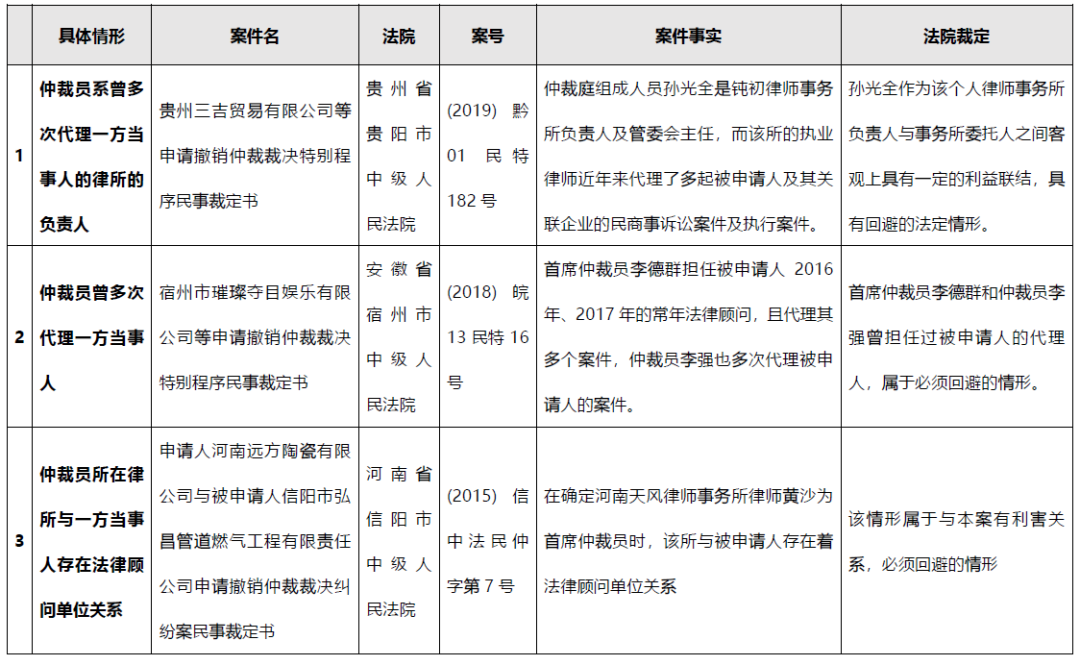 我國《仲裁法》第13條對仲裁員“公道正派”要求可以理解為是對仲裁員公正性的強調。而對不符合公正性要求的情況,《仲裁法》在第34條列舉了一些仲裁員“必須回避”的情形,而通過對我國過往法院判例的檢索,可簡要將必須回避情形的具體場景總結為以下三種,具體如下: