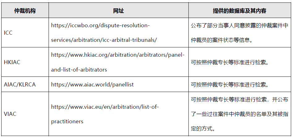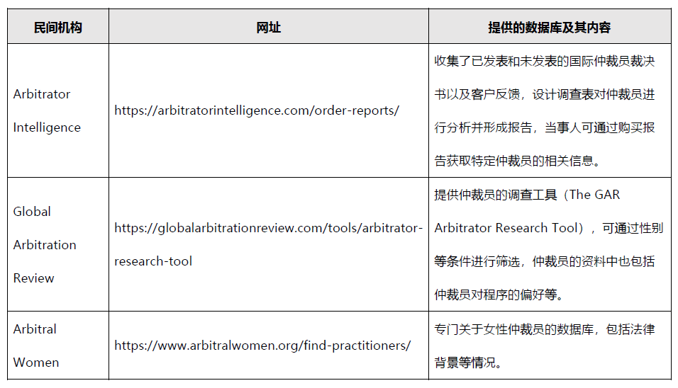 許多仲裁機構、仲裁協會和民間機構會制作仲裁員數據庫方便當事人選擇仲裁員。同時,在一些特殊的仲裁領域也會有專門的數據庫供查詢。[7]