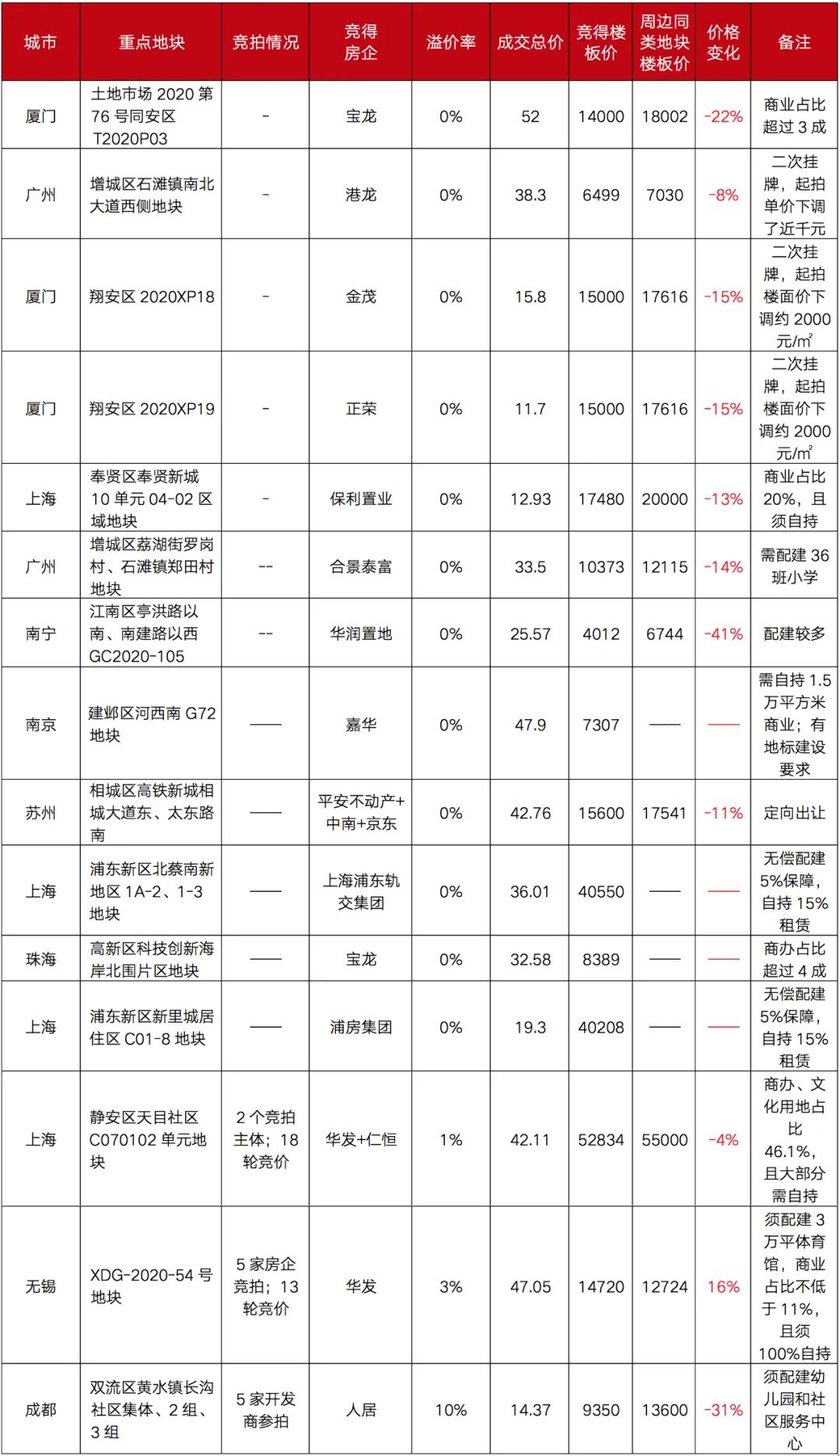 從近一個月重點地塊低溢價成交情況來看,廈門、南寧、成都等地的成交價格較同板塊內(nèi)最近成交的同類地塊相比出現(xiàn)了大幅下跌。