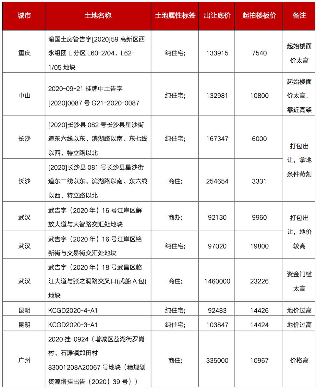 除上述兩大原因外,也有不到一成的地塊因為出讓底價過高而流拍。典型如昆明巫家壩板塊的兩宗宅地,其周邊在售新房價格約在2萬元/平方米,但該宗地的起拍價高達(dá)1.44萬元/平方米,再考慮建安、運營等成本,該宗地幾乎無盈利空間,因此該宗地最終也因無人報價而流拍。