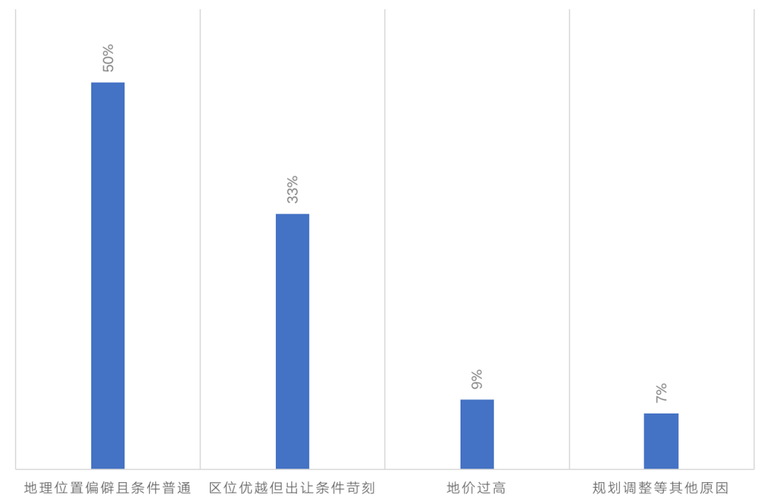 就流拍地塊的具體原因來看,除少數(shù)地塊因政府規(guī)劃調(diào)整、土地出讓條件變更等客觀原因而遭遇撤牌或提前中止出讓外,余下103宗地中大部分地塊多是因位置偏遠(yuǎn)且條件一般而流拍,位置好且拿地條件苛刻、地價過高等其他原因占比相對較低。