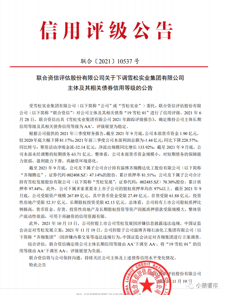11月23日,聯(lián)合資信公告稱(chēng)將雪松實(shí)業(yè)集團(tuán)有限公司(以下簡(jiǎn)稱(chēng)“雪松集團(tuán)”)主體和“19雪松01”信用等級(jí)由AA+下調(diào)至AA-,評(píng)級(jí)展望為負(fù)面。