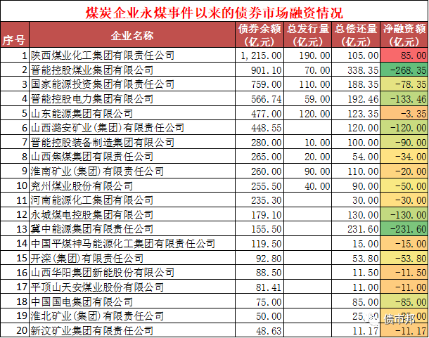 自永煤事件以來,煤炭企業的債券市場再融資受到了嚴重沖擊,債券余額排名前20的煤炭企業,除了陜西煤化工還能實現凈融資外,其余19家煤炭企業的債券市場凈融資額均為負。除了我們熟知的剛兌猛男冀中能源外,晉能控股同樣表現不俗,凈償還額268億元比冀中能源的231億還要多。