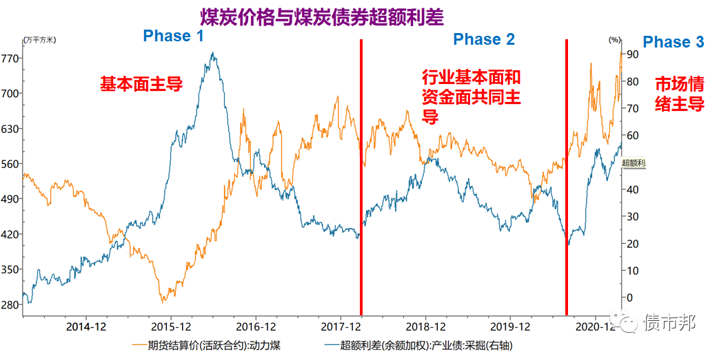 回顧2013年以來的行情,煤炭債券的超額利差主要經歷了三個階段。