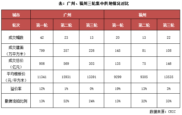 盡管廣州、福州兩城土拍門檻均明顯放松,但仍難扭轉(zhuǎn)地市熱度的下行,兩城溢價率均降至歷史低點、流拍率也仍居高位。