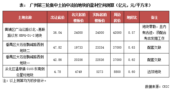 另一方面,利潤空間未及預期也是導致房企參拍意愿不強的原因。雖然廣州此次對部分地塊調(diào)低了起拍價格,但出讓地塊的條件仍然較多,實際利潤空間并不是如此充足。以再度流拍的番禺大石街兩宗地塊來看,盡管兩宗地起拍價降幅均在10%以上,但地塊一仍有1.68萬平方米的無償配建和2.42萬平的回購配建要求,地塊二也有5040平方米的無償配建和2.1萬平的回購配建要求,實際起拍樓板價約在2.3萬元/平方米左右;同時,兩宗地周邊城市界面較差,各項配套也比較缺乏,而2公里外臨近地鐵站的新盤售價僅在3.7萬元/平方米。以此價格估算,兩宗地的地房比已經(jīng)超過0.6,而受配套欠缺影響,兩宗地未來商品住宅價格勢必要更低。由此來看,大石街兩宗地塊的實際盈利空間并不高。因此,本輪這兩宗地無一房企報名參拍,最終而慘遭流拍。
