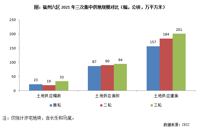 從土地供應規(guī)模上來看,福州三輪集中土拍供應宅地33宗,總供應建面201萬平方米,較前兩輪供應規(guī)模均有增加,增幅分別為28%和9%,整體來看,三輪土拍供應量還是相對充裕的。