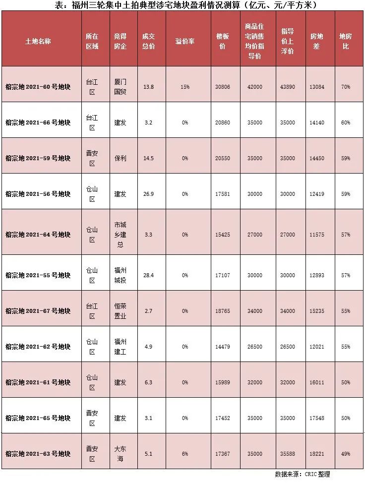 而臺江CBD地塊,由于區(qū)位優(yōu)越、配套完善,且無任何回購配建要求,成為本場土拍熱度最高的地塊(7家房企報名、最高限價+100%首期付款+搖號成交),最終該地被廈門國貿(mào)以15%的溢價競得,成交樓面價為30806元/平方米,該地商品住宅銷售指導均價約42000元/平方米(根據(jù)溢價率上浮之后的指導價為43890元/平方米),這樣測算下來,地房比為70%,房地差超13000元/平方米,再加上地塊十分稀缺,項目實現(xiàn)盈利基本不成問題。