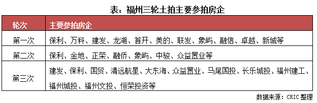 至于二輪集中土拍,福州作為重點城市土拍規(guī)則全面升級之后的第一城,由于土地競拍方式發(fā)生了一系列調(diào)整,最高限價下調(diào)至15%,競拍方式全部改為“限地價+搖號”,房企參拍情況也發(fā)生極大變化,最終導致大型國企、央企拍地數(shù)量明顯減少,僅有保利和金地有所斬獲,拿地主力多為本地民企,譬如融僑、中駿等。