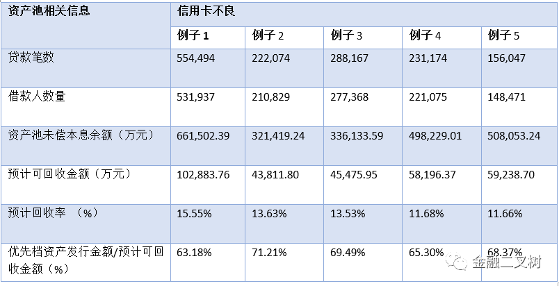 首先貸款五級分類并不能完全代表基礎資產的質量,這只是普通貸款的一個分類標準,而不良資產本身比普通貸款要復雜的多,一般來說影響信用卡不良貸款回收的主要因素為逾期金額和逾期時間。通常來講,若該筆信用卡不良貸款逾期時間短,逾期金額小,則該筆不良貸款被完全回收或部分回收的概率較高。現金流的回收不僅依賴于債務人,還依賴于催收機構。以信用卡逾期為例,信用卡債權進入不良后,部分銀行會根據逾期時間的不同將其委托給不同催收公司,催收公司接收到具體任務委托后,通過電話催收、上門催收和寄送法律函件催收等形式開展具體的催收工作,并定時將催收結果反饋給銀行,銀行對相關催收公司的催收成果進行考核并支付催收費用;另外一部分銀行做法是會先進行行內催收,然后再根據逾期時間的不同將其委托給不同催收公司。