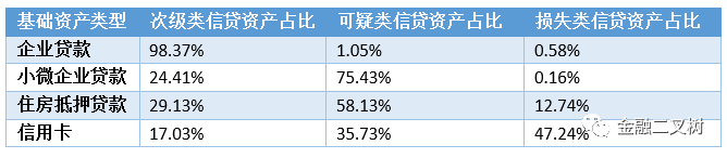 不良ABS根據基礎資產不同可以分為信用卡類、企業貸款類、小微企業貸款類、住房抵押貸款類、個人汽車貸款類、一般消費貸款類和混合貸款類。在這幾種資產中信用卡類是被認為分散度最高的,這是由于信用卡類客戶以及貸款性質決定的,這類ABS入池貸款筆數相較其他類ABS是最多的,每筆規模也普遍較小,以下表為例: