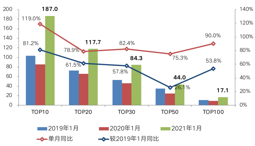 在2020年末熱點城市翹尾行情熱度延續(xù)的帶動下,2021年1月,多梯隊房企銷售業(yè)績門檻值相較去年和前年同期均有不同幅度的提升。TOP100房企銷售操盤金額的入榜門檻為17.1億元,較2020年1月同比增長90.0%,較2019年1月同比增長53.8%。