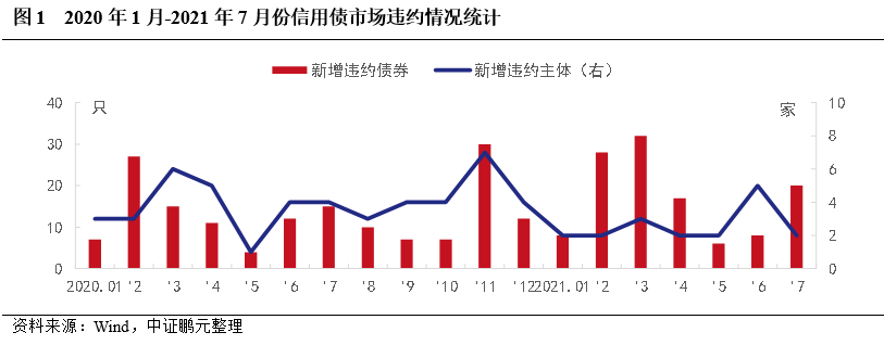 7月首次違約債券20只,違約數(shù)量出現(xiàn)明顯增長,主要是因為藍(lán)光發(fā)展的風(fēng)險顯露,存續(xù)債券陸續(xù)違約,7月首次違約債券涉及6家發(fā)行人。從違約類型看,本月新增違約債券除藍(lán)光發(fā)展的4只債券為交叉違約,其余均為實質(zhì)性違約。從違約事件看,6只為本金利息項違約,1只涉及回售款項違約,3只因破產(chǎn)觸發(fā)其到期,4只為交叉違約,6只為加速清償。從債券類型看,公司債9只,中期票據(jù)5只,定向工具3只,私募債2只,短期融資券1只。從企業(yè)性質(zhì)看,2家新增違約主體均為民營企業(yè)。從上市情況看,本月新增違約主體均為上市公司。從處置方式看,3只債券發(fā)行人與持有人達(dá)成展期兌付協(xié)議,其他債券均未公布兌付方案。