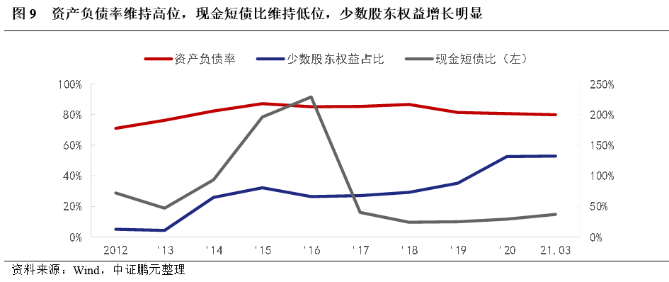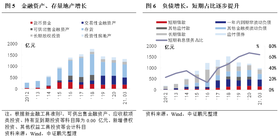 地產(chǎn)和金融不分家的邏輯,在泛海系中延伸。隨著收購的推進,泛海系打造了民生系金融家族,并在其中占有主導(dǎo)地位。轉(zhuǎn)型完成了第一階段的業(yè)務(wù)布局,進入第二階段的現(xiàn)金流綜合管理,逐步出現(xiàn)轉(zhuǎn)型中的“陣痛”。第一,地產(chǎn)板塊停止擴張,但存續(xù)項目后續(xù)投資規(guī)模較大。公司地產(chǎn)板塊土地資產(chǎn)主要為2016年之前獲得,此后以釋放存量土地價值為主。隨著地產(chǎn)項目建設(shè)投資的推進,存貨規(guī)模大幅增長,在資產(chǎn)中占比逐年增加,截至2018年3月,存貨占比63%,在建項目計劃總投資821.78億元,尚需投資343.94億元,再融資壓力較大。第二,布局金融業(yè)務(wù),帶來金融資產(chǎn)增長。通過收購(增資)亞太財險、民生期貨、民生證券和民生信托等板塊布局民生系,可供出售金融資產(chǎn)2015年、2016年出現(xiàn)大幅增長,交易性金融資產(chǎn)隨金融板塊業(yè)務(wù)的發(fā)展而增長,但業(yè)務(wù)受制于資管新規(guī)影響,金融業(yè)務(wù)板塊收入在2018年出現(xiàn)放緩,隨著2019年進一步布局金融業(yè)以及市場回暖,金融相關(guān)資產(chǎn)占比大幅提升。其中,交易性金融資產(chǎn)主要為子公司民生證券自營業(yè)務(wù)投資的證券,變現(xiàn)能力整體較好。第三,負(fù)債大幅增長,短期債務(wù)占比逐步提升,再融資壓力提升。受存量地產(chǎn)業(yè)務(wù)和金融業(yè)務(wù)擴張需求影響,2012年后公司負(fù)債規(guī)模出現(xiàn)明顯增長,其中,2014-2016年受地產(chǎn)項目融資增長影響長期借款占比大幅提升,隨著債務(wù)逐步到期,2017年以來短期債務(wù)占比逐漸增加,同時,公司長期融資規(guī)模出現(xiàn)明顯下降,再融資壓力提升,面臨集中償付風(fēng)險。