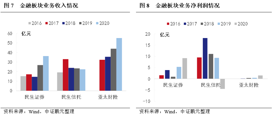 第二,金融板塊收入不確定性較高。金融板塊收入主要來自民生證券、亞太財險和民生信托,受政策和市場環(huán)境影響較大,金融板塊收入增長相對緩慢,存在一定波動性和不確定性。其中,信托業(yè)務(wù)2018年后收入呈現(xiàn)微幅下降,受風(fēng)險事件影響大額計提減值損失,2020年凈利潤轉(zhuǎn)負(fù),而保險業(yè)務(wù)收入呈現(xiàn)增長,但利潤率較低。