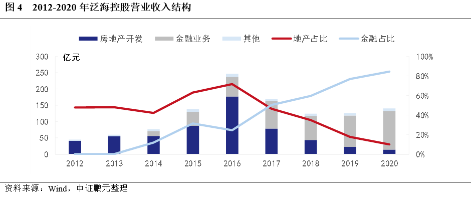 目前,泛海控股房地產(chǎn)業(yè)務(wù)以住宅產(chǎn)品為主,項目集中在武漢和美國,金融業(yè)務(wù)主要運營主體為民生證券股份有限公司(簡稱“民生證券”)、中國民生信托有限公司(簡稱“民生信托”)、亞太財產(chǎn)保險有限公司(簡稱“亞太財險”)和中國通海國際金融有限公司(0952.HK,簡稱“中國通海金融”)。房地產(chǎn)板塊受存量項目減少、金融業(yè)務(wù)增加的影響,收入占比自2016年來呈現(xiàn)明顯下降,于此同時,金融板塊收入占比逐年增加。截至2020年底,地產(chǎn)板塊業(yè)務(wù)收入占比18%,金融板塊占比77%,收入結(jié)構(gòu)完成調(diào)整。2020年1月,經(jīng)證監(jiān)會核準(zhǔn),公司行業(yè)分類由“房地產(chǎn)”正式變更為“金融業(yè)”的子行業(yè)“其他金融業(yè)”。