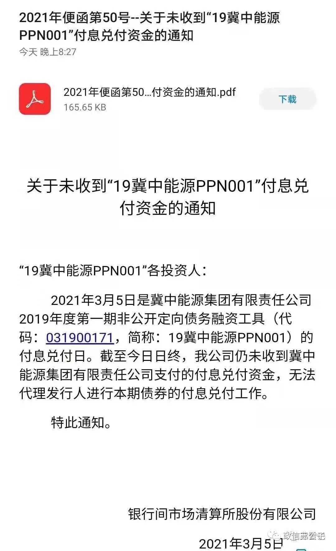 19冀中能源PPN01的本金,已經劃付到了上清所。