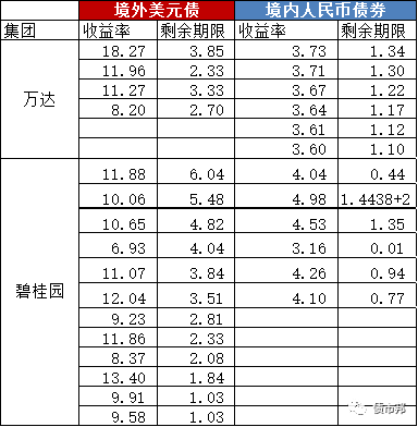下圖是阿邦在去年做的萬達和碧桂園境內外債券收益率對比(現在沒有彭博真是做不了海外債研究T_T)。