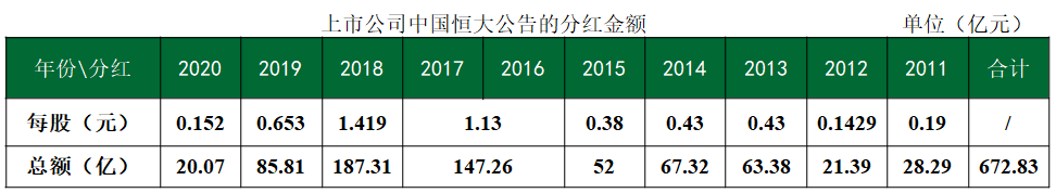 假使從上市公司股東的角度統(tǒng)計,過去十年,作為上市公司的中國恒大公告的分紅總額也超過672.83億。