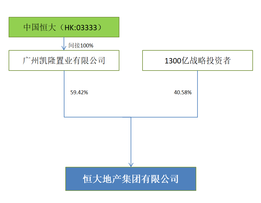 主要的區(qū)別在于,恒大集團1300億的戰(zhàn)投資金并不是投在上市公司本級,而是投在上市公司下屬子公司恒大地產(chǎn)集團有限公司(以下稱“恒大地產(chǎn)”),戰(zhàn)投占恒大地產(chǎn)40.58%的權(quán)益。