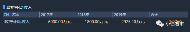 2017-2019年,云南城投分別獲得政府補助收入6000萬元、1800萬元以及2925萬元,合計1.07億元。