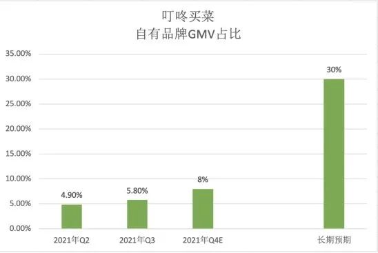 財報顯示,叮咚買菜三季度的主要自有品牌在相關品類的GMV占比已達到27.0%,同比提升22.6個百分點。平安證券報告指出,長期來看,叮咚買菜自有品牌的占整體GMV的比例將從今年三季度的5.8%提升到30%左右。