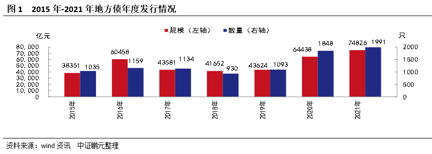 2021年上半年,由于國內經濟處于穩增長壓力最小窗口期,地方政府債券發行規模有所收縮,但下半年穩增長重要性上升,地方債發行明顯加快。具體來看,2021年,我國境內地方債共發行1,991只,同比增長7.74%,規模74,826.30億元,同比增長16.12%,無論發行只數還是發行規模均達到了地方債自發行以來的高峰。從償還情況來看,2021年總償還規模26,684.66億元,同比增長28.50%,創下自地方債發行以來新高,實現凈融資48,141.65億元,同比增長10.21%,僅次于2016年的5.8萬億元。