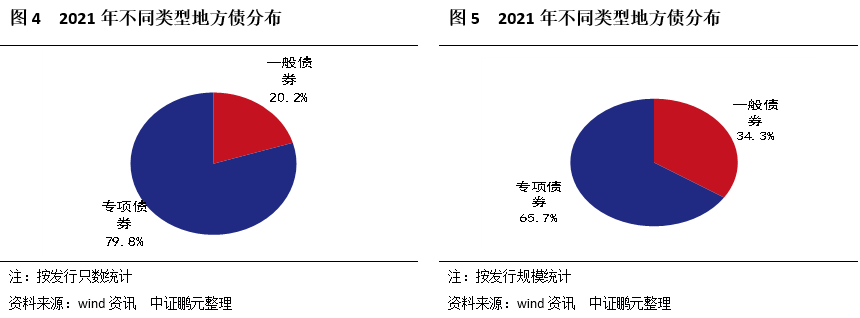2021年一般債券和專項債券發行均出現大幅擴張。一般債券方面,上半年發行規模上升,下半年出現下降。專項債券方面,上半年由于監管層對專項債項目審核趨嚴,發行出現萎縮,但下半年為了應對經濟下滑局面,專項債券發行出現大幅擴張。具體來看,2021年,地方債一般債券共發行403只,同比上升23.24%,占全年地方債發行之比為20.2%,發行規模25,636.18億元,同比上升11.30%,占比34.3%;專項債券1,588只,同比上升4.40%,占比79.8%,發行規模49,190.13億元,同比上升18.80%,占比65.7%。2021年下半年,地方債一般債券共發行214只,同比上升15.68%,發行規模9,532.93億元,同比下降19.86%;專項債券1,122只,同比上升74.49%,發行規模31,881.93億元,同比上升80.34%。