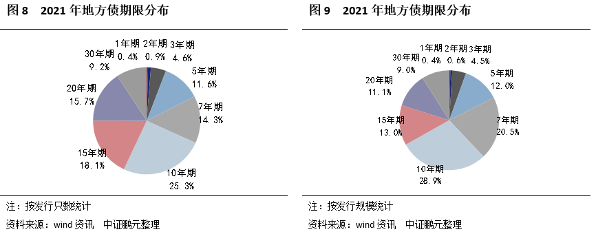 相比2020年,2021年地方債期限結構多了1年期債券,主要包括1年期、2年期、3年期、5年期、7年期、10年期、15年期、20年期、30年期共9個期限,但仍以10年期為主。具體來看,2021年10年期發行最多,共發行503只,占比25.3%,其次15年期,共發行360只,占比18.1%;規模方面,10年期發行規模最大,發行規模為21,619.74億元,占比28.9%,其次7年期,發行規模為15,306.77億元,占比20.5%。