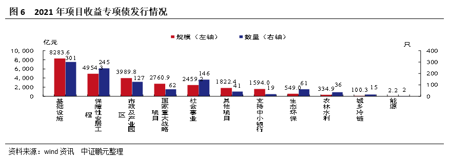 項目收益專項債方面,2021年共發行1,055只,規模26,850.72億元,分別同比減少9.8%和10.6%。從種類來看,發行規模居前三位的項目類型為基礎設施建設、保障性安居工程和市政及產業園區,分別為8,283.65億元、4,954.31億元、3,989.85億元,發行只數居前三位的類型分別為基礎設施建設、保障性安居工程、社會事業,分別為301只、245只、146只。2021年項目收益專項債中支持中小銀行專項債券發行提速,2020年僅發行506億元,到2021年發行了1,594億元,上升了近3倍,并且2,000億元額度已全部用完,規模略有超過,應為遼寧多發行了100億元所致。