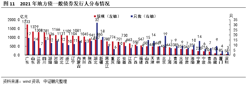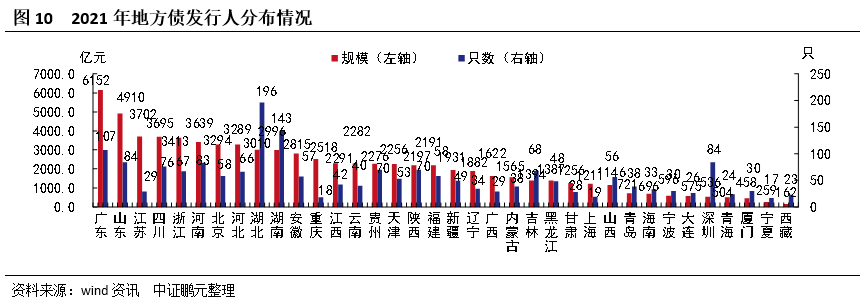 2021年,31個省份、5個計劃單列市均發行了地方債。地區分布方面,廣東、山東這些東部發達地區發行靠前,中部地區河南比較靠前,西部地區四川較為突出。具體來看,規模方面,廣東發行規模最大,共發行6,151.76億元,其次為山東,發行4,910.16億元,再者為江蘇,發行3,701.85億元。西藏、寧夏等西部地區發行相對靠后,分別發行162.31億元、259.42億元,位居倒數第一位和第二位。發行數量方面,湖北發行數量最多,共發行了196只,其次為湖南,發行了143只,再者為廣東,發行了107只,寧夏和新疆分別發行12只和17只,位居倒數第一位和第二位。另外,四川和河南分別位居發行規模的第四位和第六位,相對靠前。