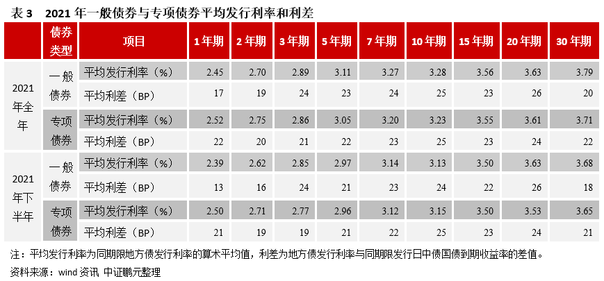 4、同期限一般債券平均發行利率整體高于專項債券。2021年,除1年期和2年期外,同期限一般債券平均發行利率整體高于專項債券。具體來看,1年期、2年期、3年期、5年期、7年期、10年期、15年期、20年期和30年期一般債券平均發行利率分別為2.45%、2.70%、2.89%、3.11%、3.27%、3.28%、3.56%、3.63%和3.79%,平均利差分別為17BP、19BP、24BP、23BP、24BP、25BP、23BP、26BP和20BP。專項債券1年期、2年期、3年期、5年期、7年期、10年期、15年期、20年期和30年期平均發行利率分別為2.52%、2.75%、2.86%、3.05%、3.20%、3.23%、3.55%、3.61%和3.71%,平均利差分別為22BP、20BP、21BP、22BP、23BP、25BP、23BP、24BP和22BP。