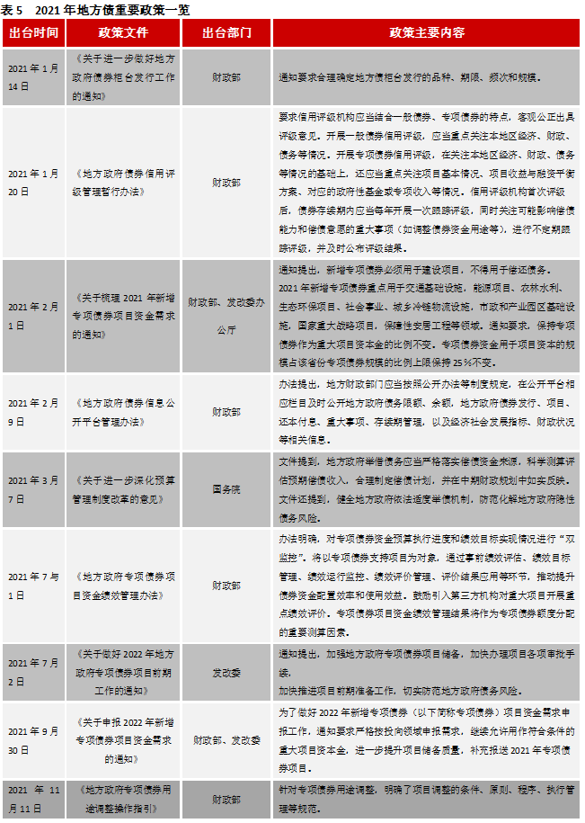 2021年地方政府相關政策主要有兩條主線,一是繼續加強對地方債的管理,包括從柜臺發行、信用評級、信息公開等方面加強管理,二是加強對專項債券的監管成為一項重要的政策內容,比如上半年出臺的《關于梳理2021年新增專項債券項目資金需求的通知》,對專項債券資金投向和審核條件作了進一步的明確要求。下半年,地方政府債券相關政策主要集中在專項債券領域,包括兩方面,一是完善專項債券管理,文件主要包括《地方政府專項債券項目資金績效管理辦法》和《地方政府專項債券用途調整操作指引》,前者主要內容是對專項債券項目實施績效管理,通過事前績效評估、績效目標管理、績效運行監控、績效評價管理、評價結果應用等環節,推動提升債券資金配置效率和使用效益,后者主要內容是針對專項債券資金用途調整作出了相關規定。二是推進做好2022年地方政府專項債券項目前期工作,文件主要包括《關于做好2022年地方政府專項債券項目前期工作的通知》和《關于申報2022年新增專項債券項目資金需求的通知》,前者主要內容是加強地方政府專項債券項目儲備,加快辦理項目各項審批手續,加快推進項目前期準備工作,后者主要內容是針對2022年新增專項債券項目資金需求申報工作,要求嚴格按投向領域申報需求,繼續允許用作符合條件的重大項目資本金,進一步提升項目儲備質量。