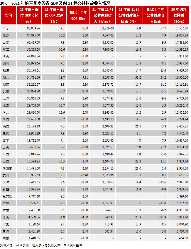 3、2021年上半年,我國經濟處于恢復態勢,但從第三季度數據來看,經濟恢復態勢遇到了一定的波折。前三季度,除個別省份外,各省經濟增速和公共財政收入增速整體出現回落,地方政府性基金收入回落幅度較大。盡管第四季度經濟增長略有所企穩,但當前的經濟財政形勢反映出穩增長重要性依然上升,同時各省還面臨著較大的財政壓力。