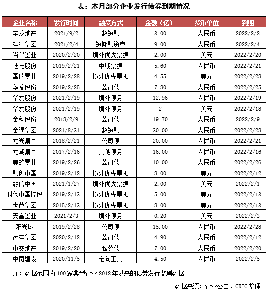 本月房企有22筆債券到期,金額共計376.20億元,環比下降36.7%,到期債券只數環比減少17只。值得注意的是,本月有銀城國際就企業存續期境外債完成了部分債券的交換要約,相當于2022年2月到期的債券到期時間已經成功延期,新票據期限為364天。