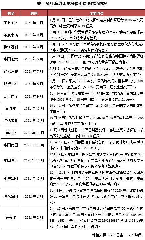在債務違約方面,2月18日陽光城發布公告稱企業未能在 30 日豁免期內(即 2022 年 2 月 15 日)支付境外債券利息共2726.25萬美元,企業海外債發生了實質性違約。再加上佳源等企業被曝出出現了流動性問題,房企的流動性危機仍在持續,未來仍有可能曝出更多的債務違約事件。
