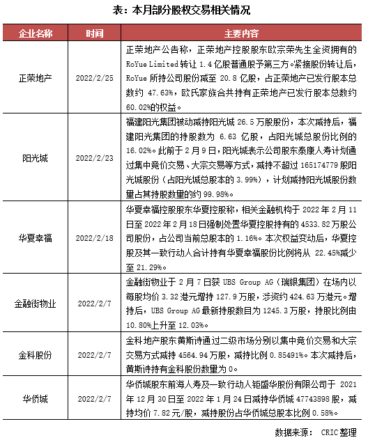 本月房企及房企旗下公司的股權變動較少,僅有正榮、陽光城、華夏幸福、金科等企業出現了規模較小的股東股權變動,其中陽光城和華夏幸福都出現了控股股東的被動減持。整體看來,本月出現股權變動的企業有部分原因是因為企業流動性問題,未來這些企業的經營以及自救都有待觀察。