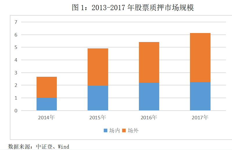 2013年政策放開場內質押后,場內規模不斷提升,從2014年的0.27萬億元,上升到2017年底的2.7萬億元。