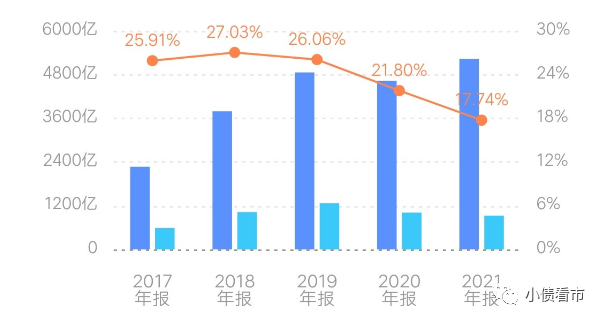 值得注意的是,碧桂園本就不高的毛利率,近年來持續(xù)走低,2021年其毛利率和凈利率分別為17.74%和7.84%,盈利能力欠佳。