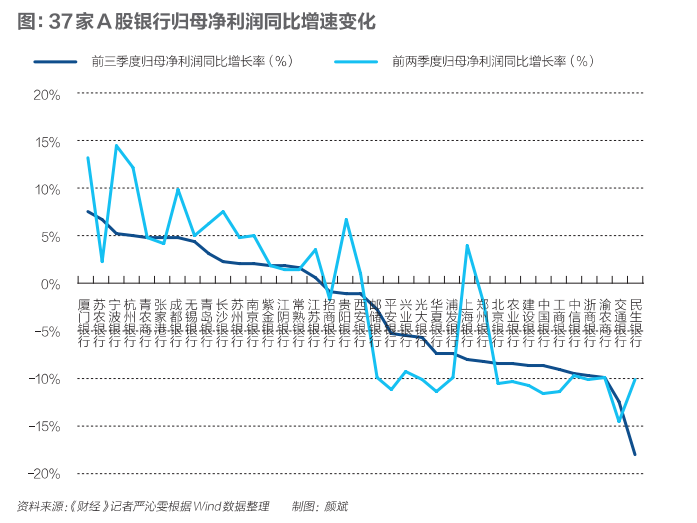 具體來看,三季度大部分銀行的凈利潤同比增速有所回升。Wind數據顯示,在A股37家上市銀行中(較半年報新增廈門銀行),20家銀行前三季度凈利潤同比增速較前兩季度有所回升,其中15家銀行同比降幅收窄。交通銀行金融研究中心高級研究員武雯指出,撥備計提力度減弱是凈利潤同比降幅收窄的首要因素。