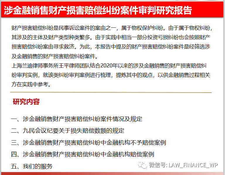 上海蘭迪律師事務所王平律師團隊結合2020年以來的涉及金融銷售的財產損害賠償糾紛審判實例,就該類糾紛審判案例進行梳理,提煉其中的裁判要旨等,以供金融銷售過程相關方在實踐中參考。本次研究的對象為自2020年以來涉及金融銷售的財產損害賠償糾紛司法案件判決書。