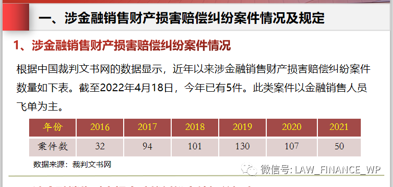涉及金融銷售的財產損害賠償糾紛案件主要以銷售機構員工“飛單”為主,案件審判涉及員工與機構是否侵權的判定,以及員工和機構之間的責任界定。