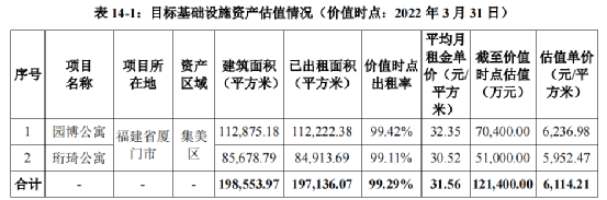 根據(jù)國融興華出具的初始評估報告,截至2022年3月31日,投資性房地產(chǎn)資產(chǎn)組價值為70,400.00萬元和51,000.00萬元,合計為121,400.00萬元,折合單價分別為6,237元/平方米和5,952元/平方米。