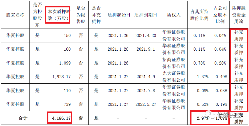 1月29日,華夏幸福公告,公司的控股股東華夏幸福基業控股股份公司及其一致行動人新增質押4,186.17萬股,占其所持股份比例為2.97%,用途為補充質押,質權人為華泰證券、招商證券和光大證券等證券公司。華夏幸福控股股東此次補充質押股票,是為其前期質押融資業務進行的補充質押。直接原因可能是華夏幸福近期的二級市場股價的下降。