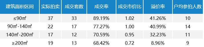 根據上述統計,95套住宅中在≤90㎡這個價格區間房源最多為37套,成交率最高,折扣率為1,表明小戶型不論在法拍市場還是二手房市場都占有較大優勢。溢價率最低的是≧200㎡的房產,表明上拍房產多成交活躍度低,溢價率最高的為≦90㎡的房產,這是由于中小戶型房屋一直是人們的不二選擇,也由于眾多學區房隸屬的區域中小戶型偏多。
