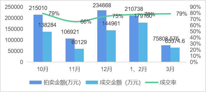 近半年拍賣金額和成交金額最高都在12月,最低在3月。成交率最高在10月,最低在11月。近半年來成交率穩步上升升,10月、11月出現較大波動考慮因上拍量突然下降市場溫度降低,近三月成交率相對平穩市場狀態良好。